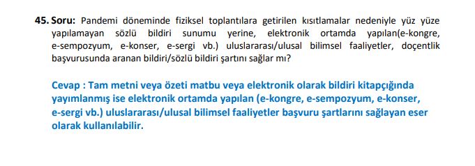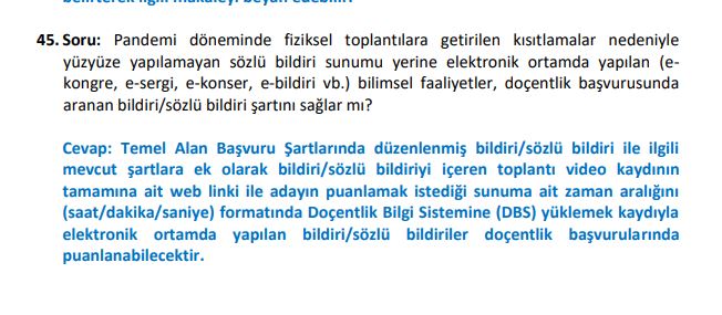 45. Soru: Pandemi döneminde fiziksel toplantılara getirilen kısıtlamalar nedeniyle yüz yüze yapılamayan sözlü bildiri sunumu yerine, elektronik ortamda yapılan(e-kongre, e-sempozyum, e-konser, e-sergi vb.) uluslararası/ulusal bilimsel faaliyetler, doçentlik başvurusunda aranan bildiri/sözlü bildiri şartını sağlar mı?