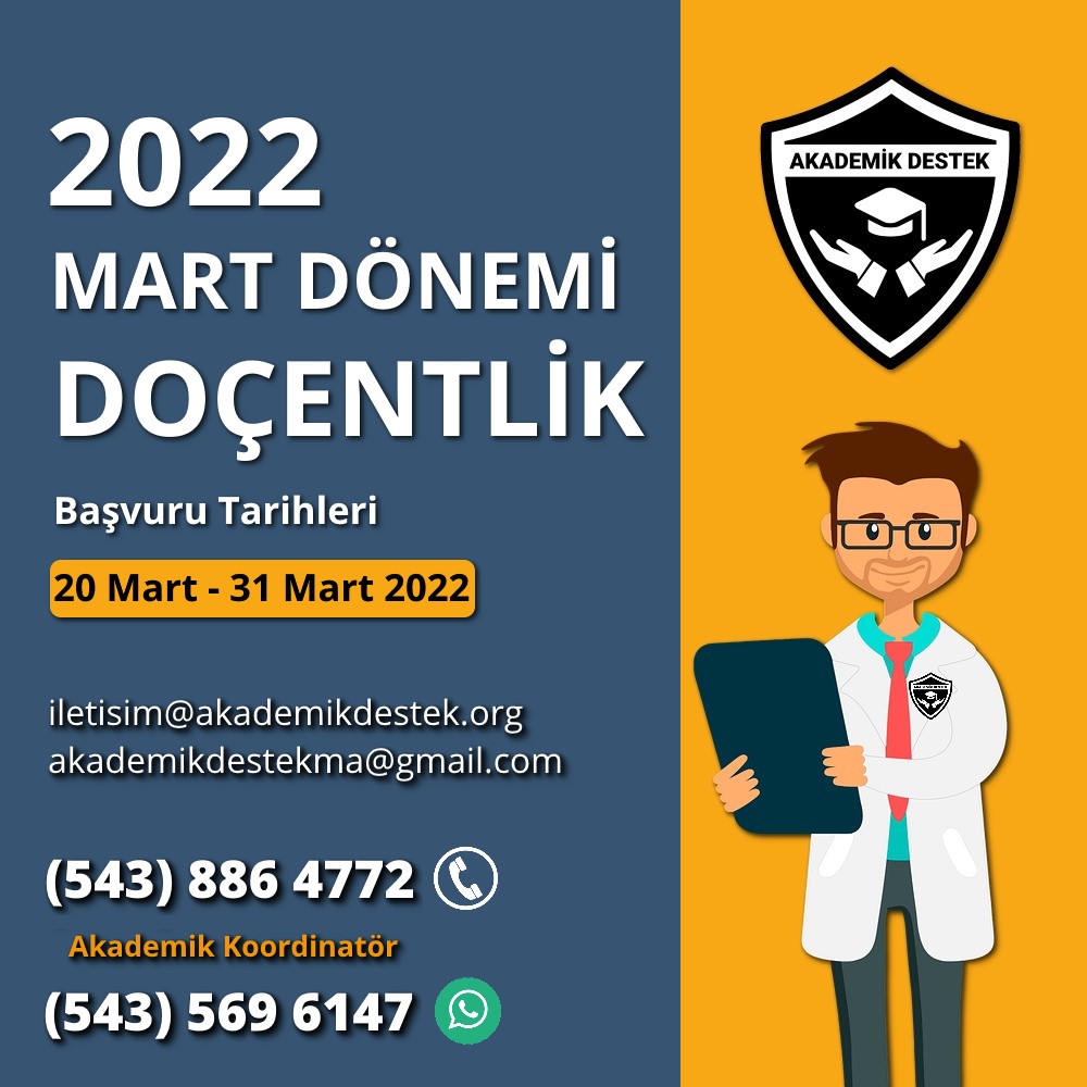 2022 Mart Dönemi Doçentlik Başvuruları; doçentlik yönetmeliği gereğince 20 Mart 2022 günü başlayıp, 31 Mart 2022 günü 17:30’a kadar devam edebilir, nihai karar ÜAK’a aittir.