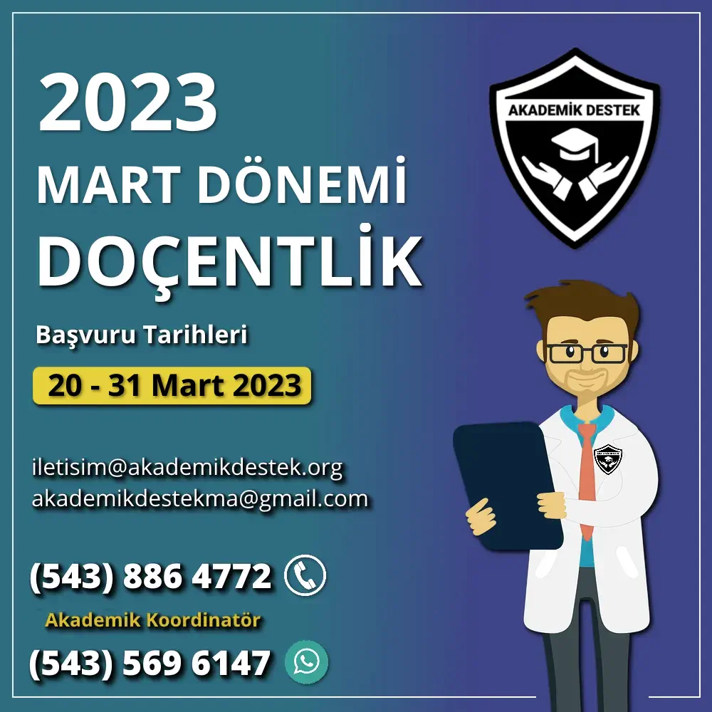 2023 Mart Dönemi Doçentlik Başvuruları; doçentlik yönetmeliği gereğince 20 Mart 2023 Pazartesi günü başlayıp, 31 Mart 2023 Cuma günü 17:30’a kadar devam edecektir. Nihai karar ÜAK’a aittir.