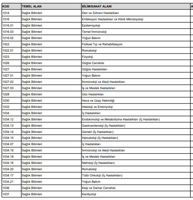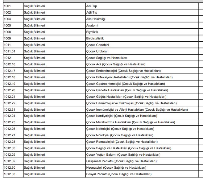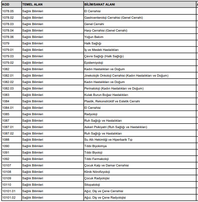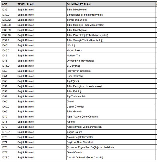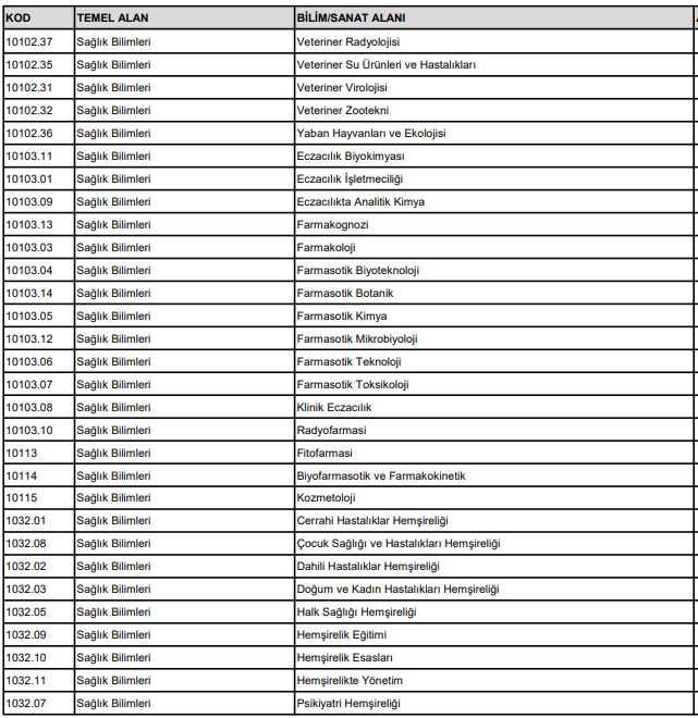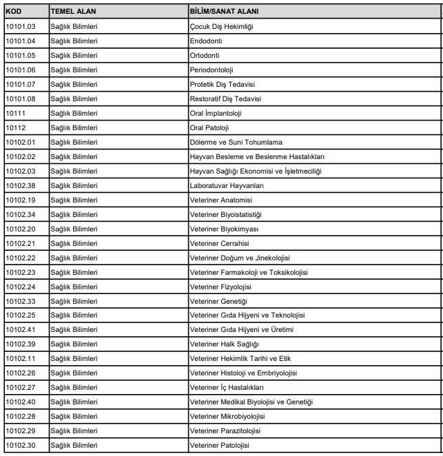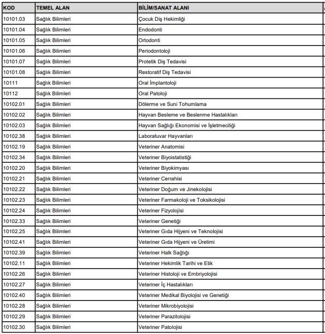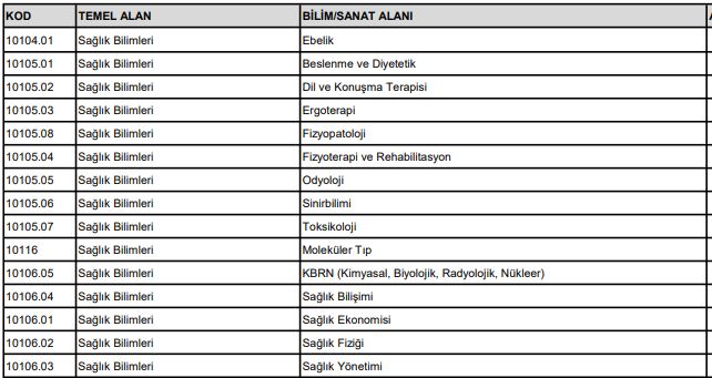 Sağlık Bilimlerinde Önceden 149 adet bilim alanı bulunurken, güncelleme sonrası 180 adet bilim alanı oluşturulmuştur.