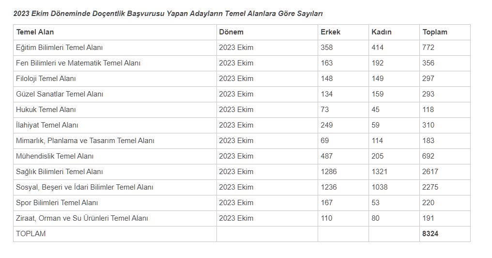 2023 Ekim döneminde, Doçentlik Bilgi Sistemi (DBS) aracılığıyla toplam 8324 aday, doçentlik başvurusunda bulunmuştur.