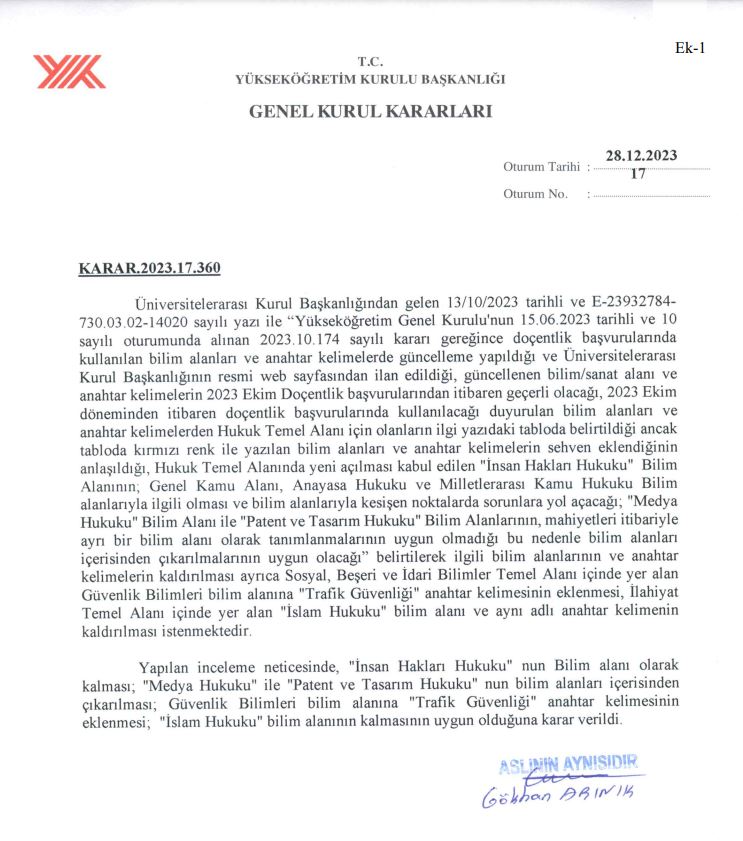 Yükseköğretim Genel Kurulu, 28 Aralık 2023 tarihinde gerçekleştirdiği 17 sayılı oturumda aldığı 2023.17.360 sayılı karar doğrultusunda doçentlik başvurularında kullanılan bilim alanları ve anahtar kelimelerde güncelleme yapma kararı aldı.
